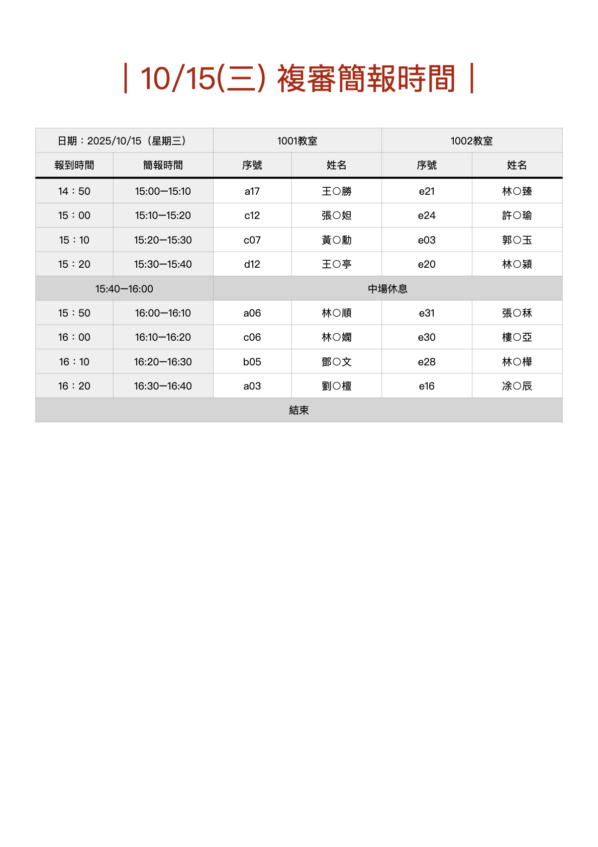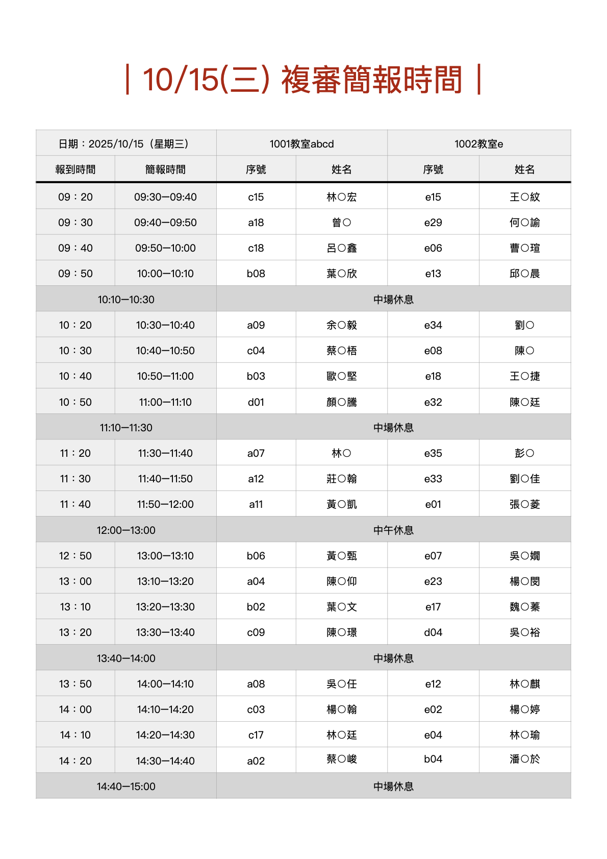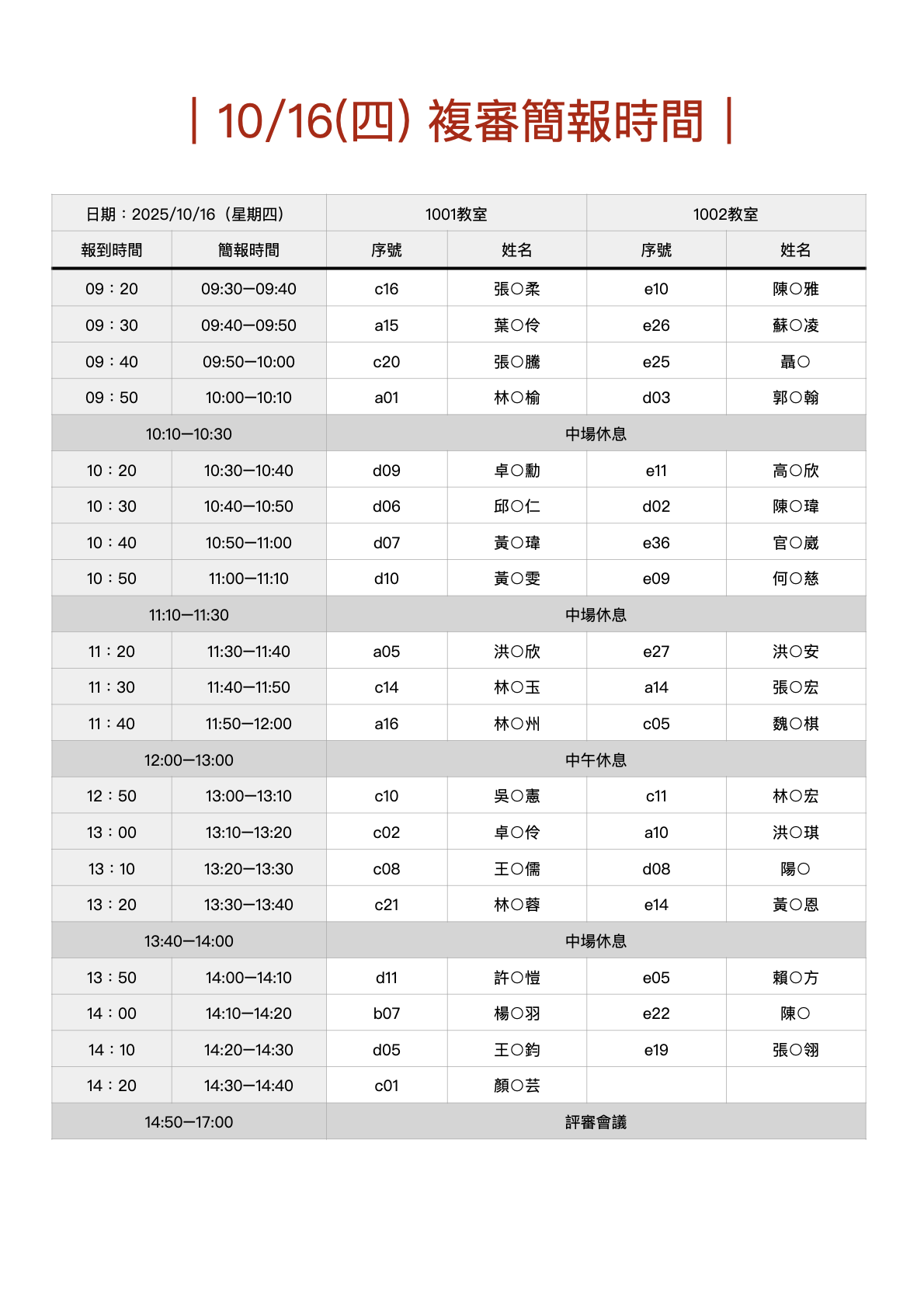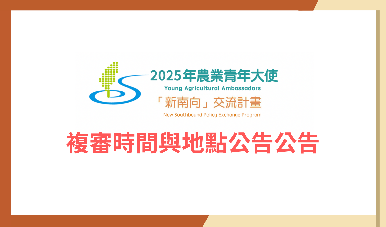 複審時間與地點公告2025年10月3日/在: 新聞 複審面試時間與地點已同步公布於 2025 年農青大使官網 FB 粉絲專頁 ━━━━━━━━━━━━━ ▎複審日期:2025/10/15(三)、2025/10/16(四) ▎複審時間:請見下圖 ▎複審地點:台北市進出口商業同業公會 10F 1001、1002 教室(台北市中山區松江路 350 號) 詳細辦法以甄選辦法中訂定為主 簡報繳交方式與其他提醒事項,請詳見初審合格通知 Email 內容 諮詢及聯絡方式: 官方Line@:https://lin.ee/slMEZfC 諮詢信箱:agamb.work@gmail.com #農業青年大使 #新南向交流 #agamb #圓夢國家隊農青挺台灣 #TeamTaiwan https://agamb.mofa.gov.tw/wp-content/uploads/2025/10/綠松石色配紅色-10.png 918 1562 jambo /wp-content/uploads/2017/06/logo.png jambo2025-10-03 17:24:092025-10-03 17:24:09複審時間與地點公告